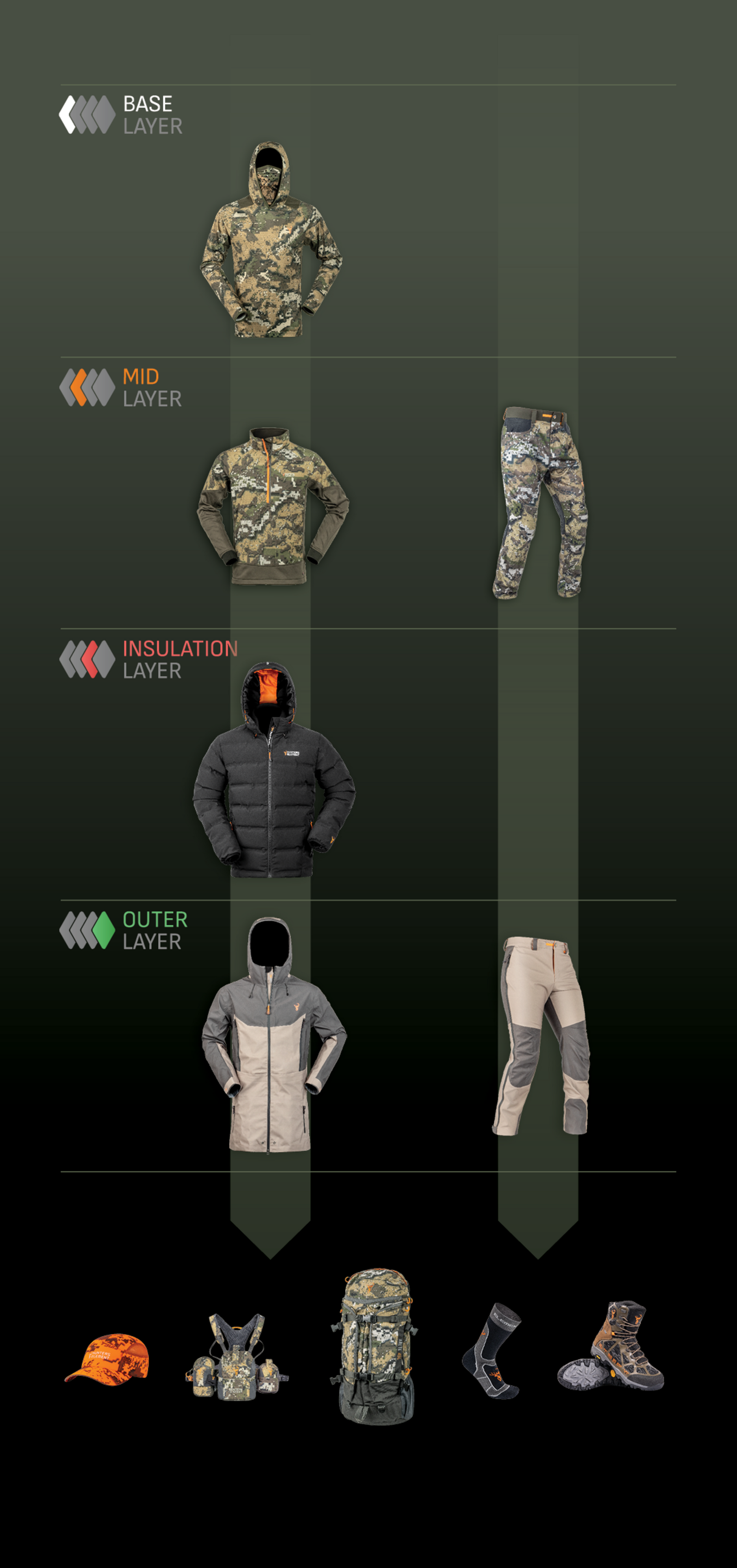 We’ve eliminated seam stacking to avoid pressure points under pack straps and belts. The fit of each layer is purpose-engineered — close-fitting bases, freer mids, protective outers — giving you full mobility without bulk.
