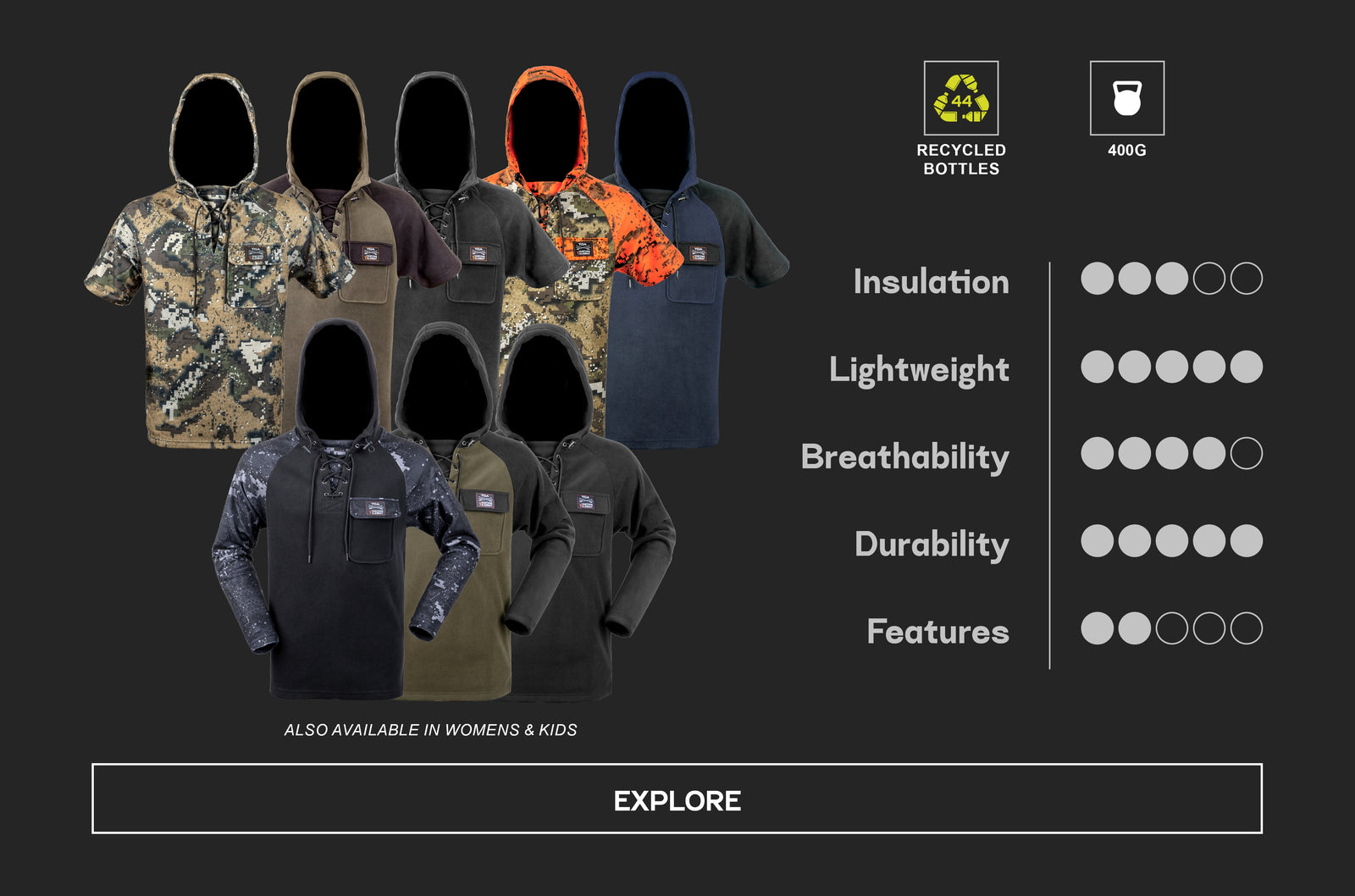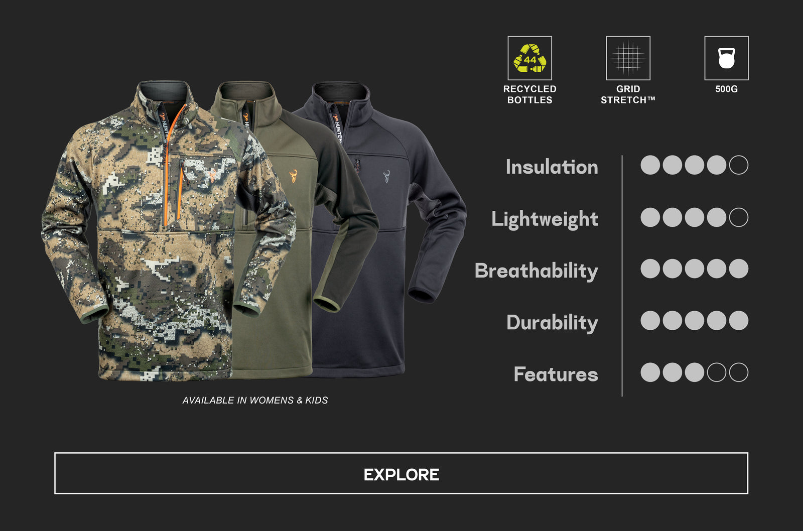 The Hunters Element range is based on a 3-layer system: base layer, mid-layer and outer layer. These mid-layers are designed to be worn above our base-layers (such as the Core or Core+ range) and underneath our outer layer jackets which are designed to withstand extreme elements (such as our Odyssey Jacket V2, Storm Jacket, or Halo Jacket).