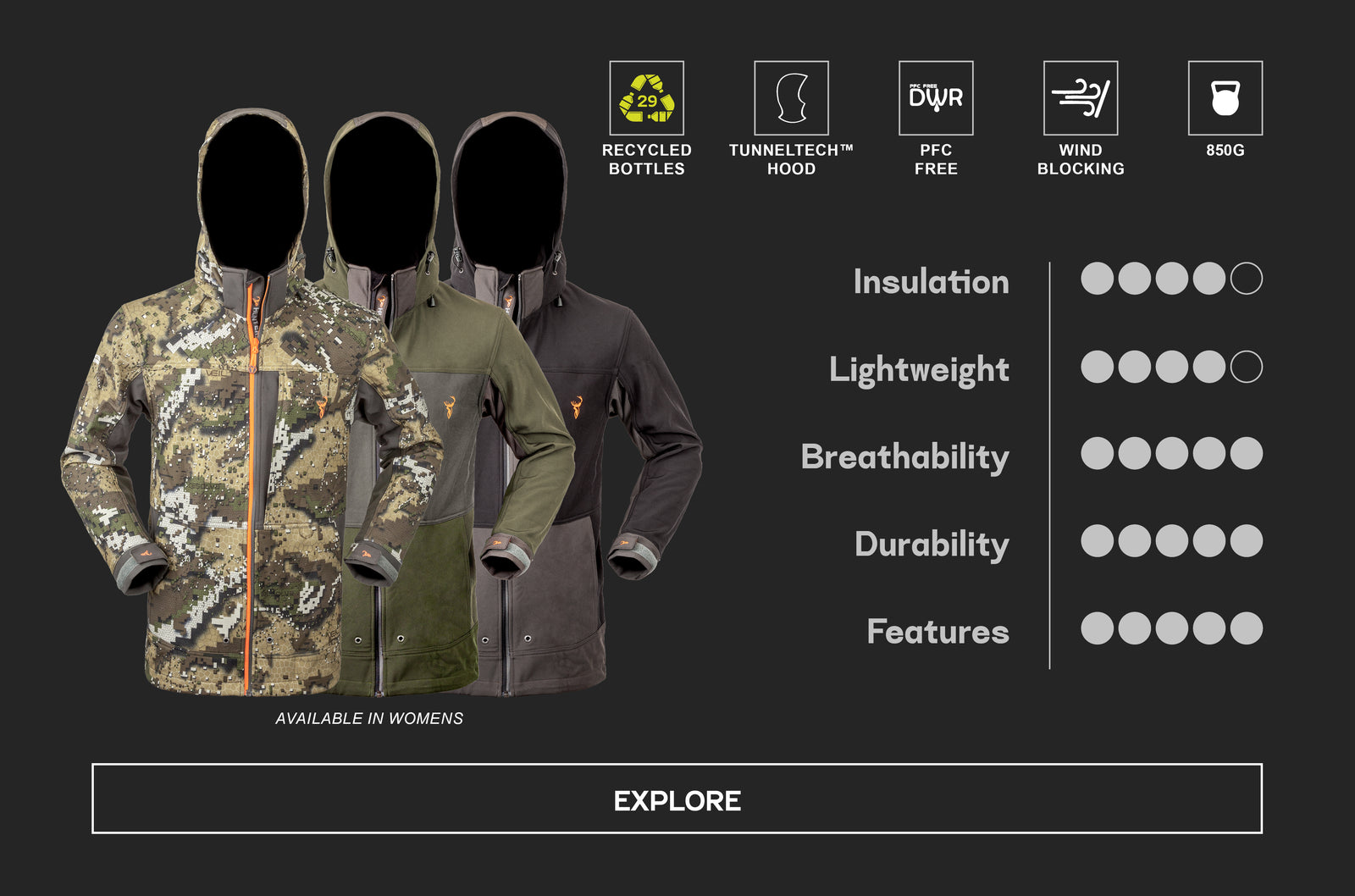 All three layers used together ensure you warm up, cool down and stay dry for superior performance in the field. The fabric technology in each layer has been thoughtfully designed to best regulate your temperature, breathe out excess heat and sweat, and keep you protected from the harsh elements.