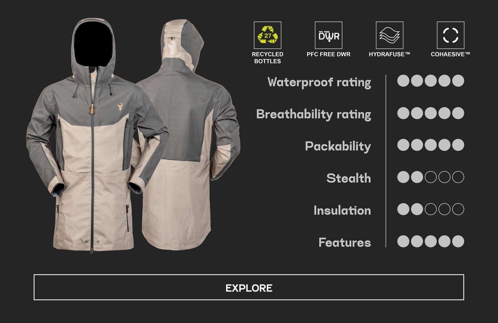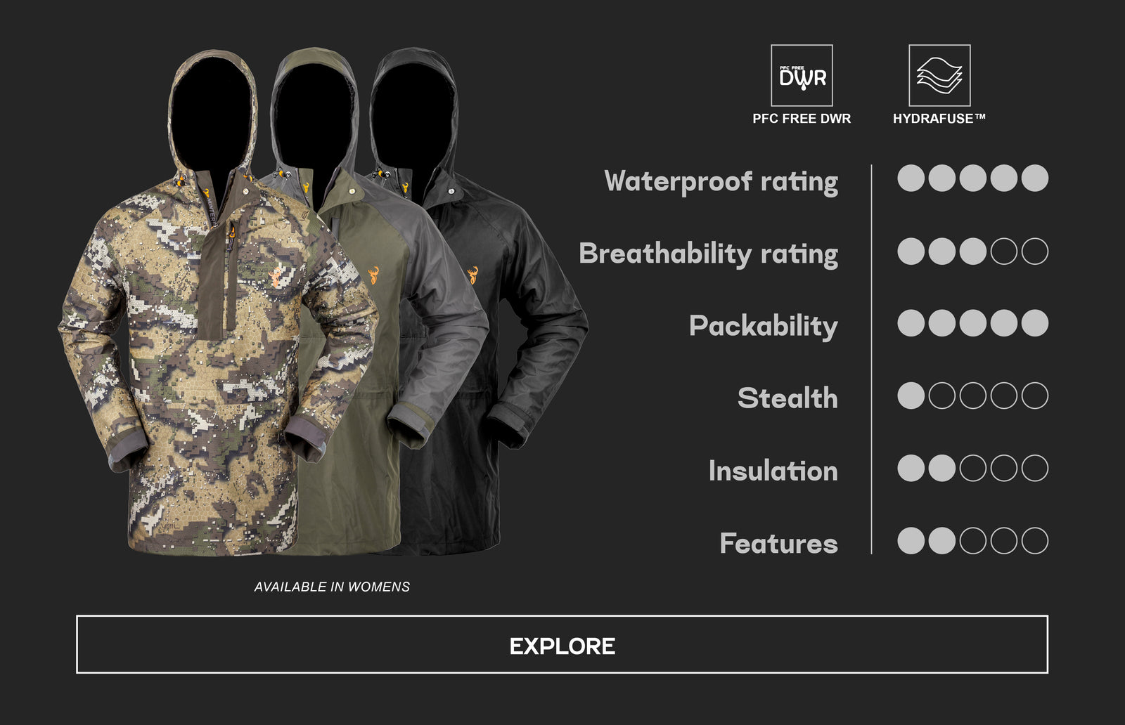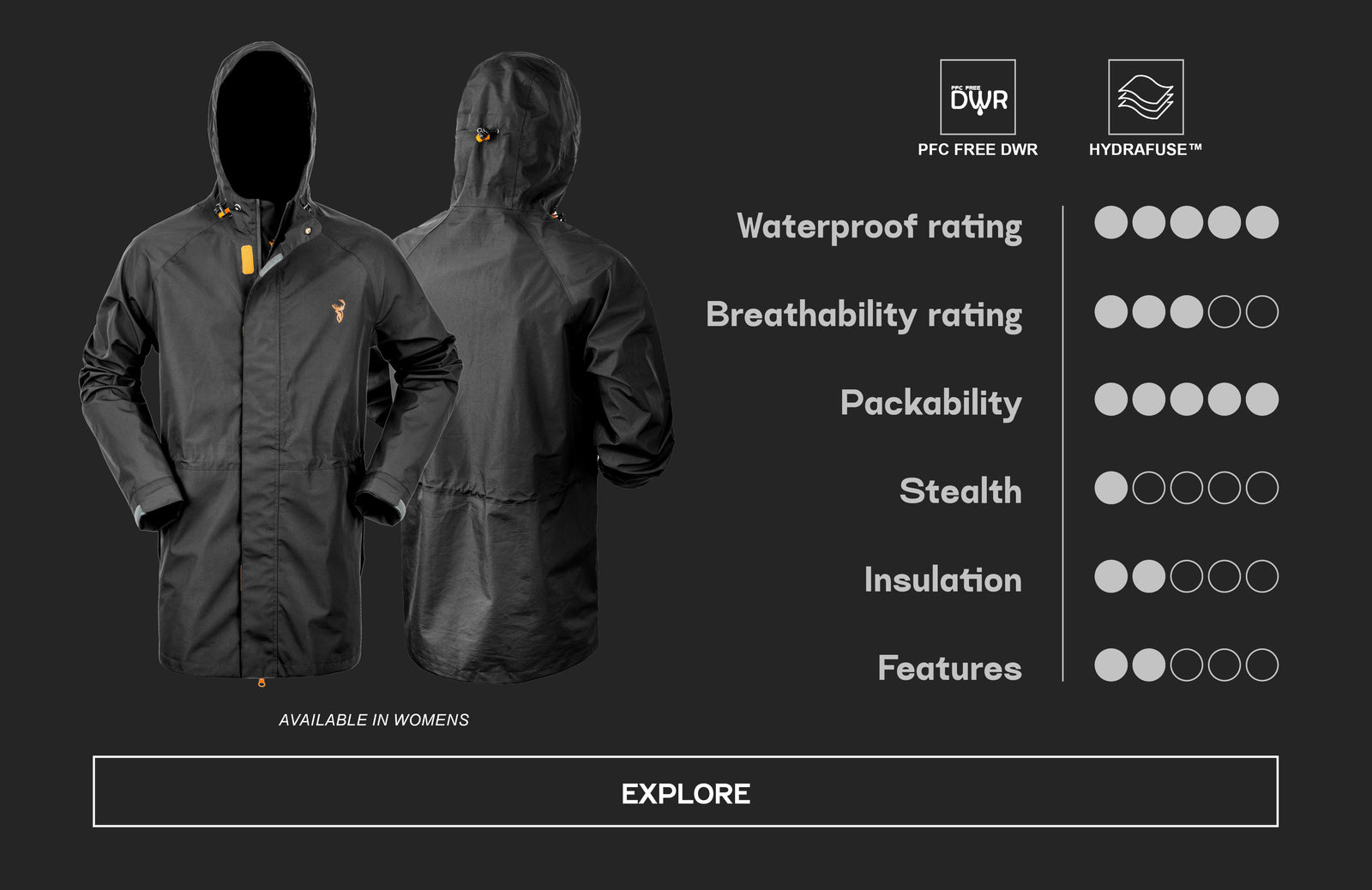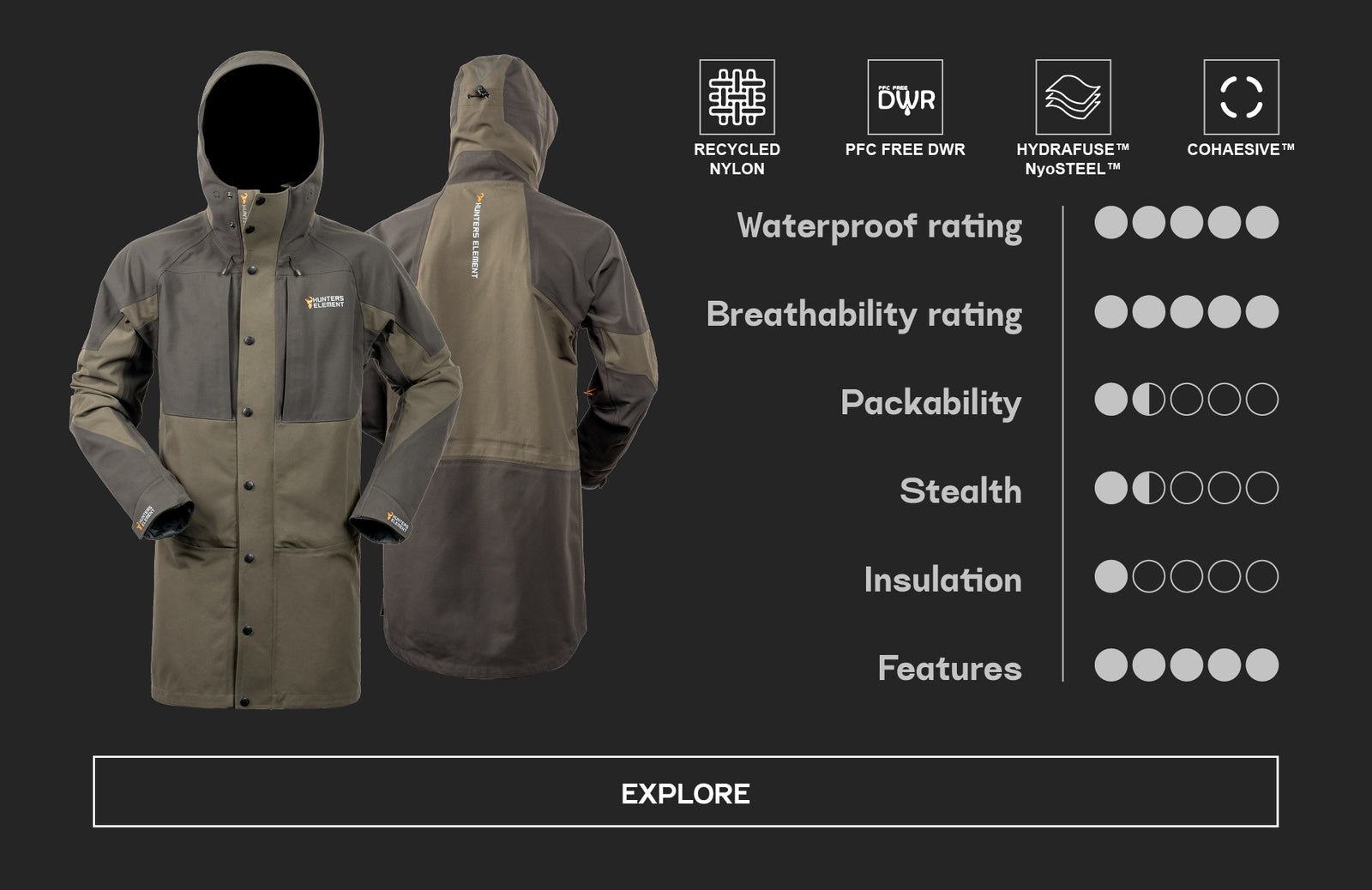 The Downpour Elite is a jack of all trades and is stealthy, ideal for bush stalking. It is well suited to waterfowl hunting as it’s shorter (so it won't get in the way when you’re sitting and wading) and the deep bellowed lower pockets are ideal for dumping ammo.