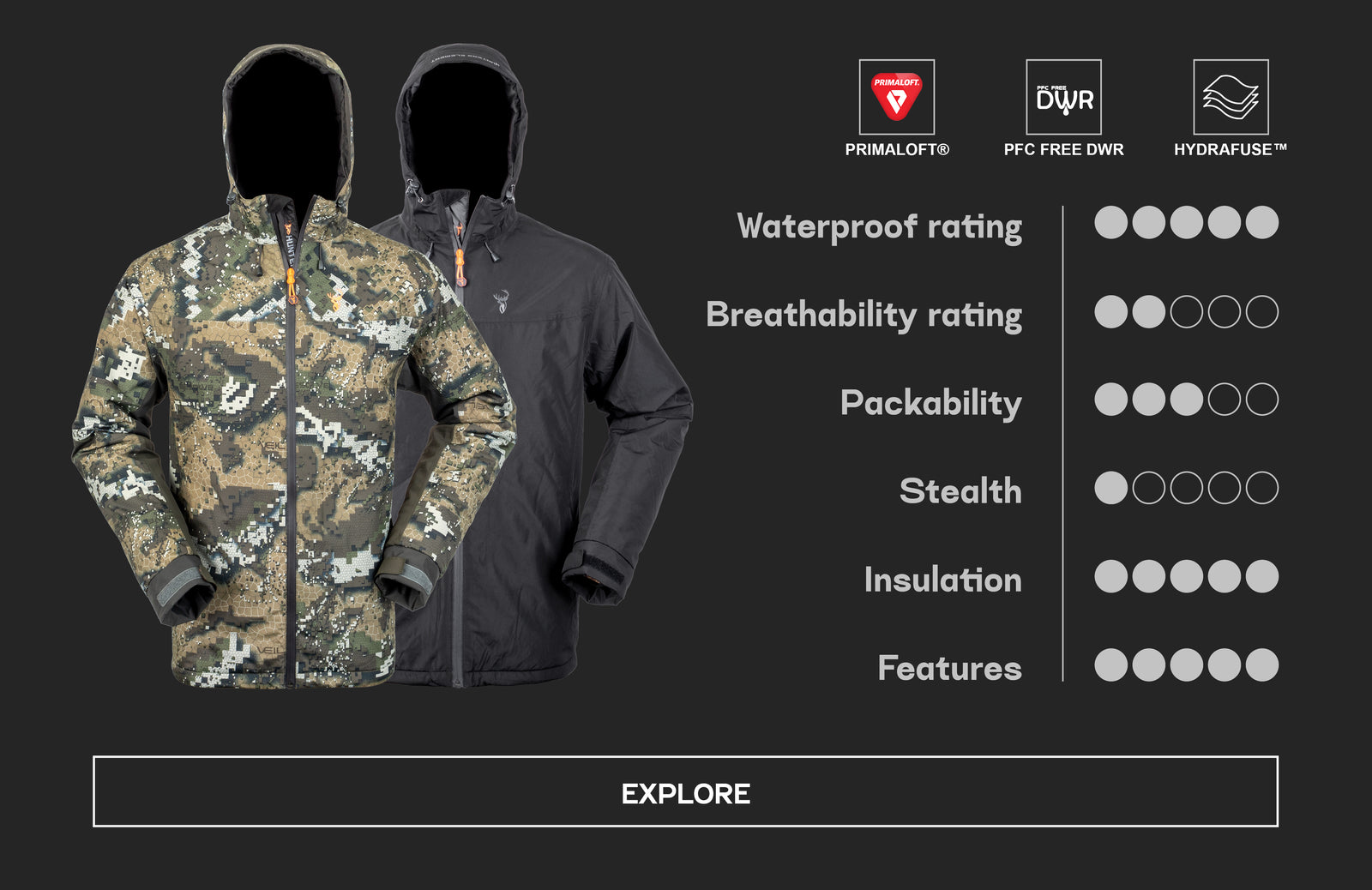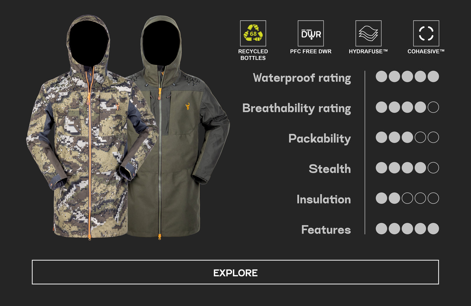 The Hunters Element range is based on a 3-layer system: base layer, mid-layer and outer layer. These outer layers are designed to be worn above our base-layers (such as the Core or Core+ range) and our mid-layer range (such as the Legacy Jacket, Zenith top or Whakarapu Hood).